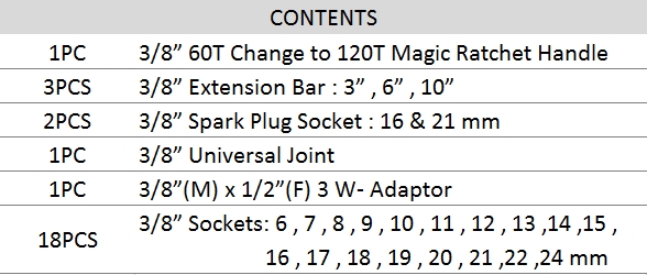 Recherche avancée 1/4" 3/8" 1/2" 3/4" 1" 1-1/2" ACCUEIL » OUTILS PNEUMATIQUES » OUTIL À MAIN » Poignée à cliquet » Magic Handles » 26PCS 3/8” Dr. Socket Set 26PCS 3/8” Dr. Socket Set modèle : S0326KMC quantité : Add To Inquiry Caractéristiques S0326KMC 26PCS 3/8” Dr. Socket Set Produits similaires 60T Change To 120T Magic Ratchet Handle - 3/8”modèle : RH89-38 Add To Inquiry 60T Change To 120T Magic Telescopic Ratchet Handle – 3/4”modèle : RH90-34 Add To Inquiry 60T Change To 120T Magic Telescopic Ratchet Handle - 1/2”modèle : RH88-12 Add To Inquiry 60T Change To 120T Magic Ratchet Handle - 1/2”modèle : RH89-12 Add To Inquiry 60T Change To 120T Magic Ratchet Handle - 3/8”modèle : RH87-38 Add To Inquiry 26PCS 1/2” Dr. Socket Setmodèle : S0426KMC-2 Add To Inquiry